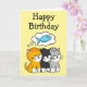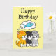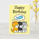 Önska någon en lycklig födelsedag med detta söta kort. Tre söta kattungar som sitter på rad, en är en rödbrun tabby, en annan är en svart-vit smokingkatt och den tredje en liten grå kattunge. De tänker alla glatt på den läckra blå fisken de ska ha till te. Bakgrunden är en ljusgul färg.