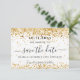 Ett giftigt och trendig Spara datumkortet för en 30:e (eller någon annan ålder) födelsedagsfest. En snyggt vit bakgrund som dekoreras med faux guld-gnistor. Texten: Spara datumet skrivs med ett stort trendig-handskript i stil.