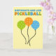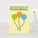 Det här födelsedagskortet är perfekt för pickleball-spelare. Det har illustrationer av pickleball-formade ballonger mot en ljusgul bakgrund. Meddelandet på framsidan lyder "Födelsedagar är som pickleball". Meddelandet på insidan lyder: "Alla kommer att göra det någon gång, och du får det att se lätt ut. Grattis på födelsedagen!"