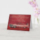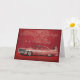 Ett elegantt födelsedagkort med en koppla ihop i aftonklänningen som beundrar en rosa Cadillac för vintage bil mot en slå röd bakgrund.