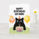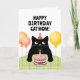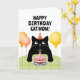 Grattis på födelsedagen kattmamma kort med liten svart katt, födelsedagstårta och ballonger.