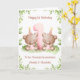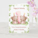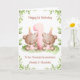 Det här födelsedagskortet är lämpligt för tvillingflickor. Designen inkluderar en akvarell kant med grönska, siffran 1 i rosa och två bruna teddybjörnar med födelsedagsballonger och födelsedagshattar.