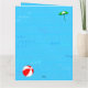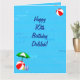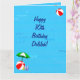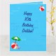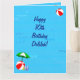 Ett födelsedags kort för Delilah med ett roligt pool tema, dekorerat med en röd strandboll, grön parasoll, sandaler och sololja på en blå vattenbakgrund med vågor.