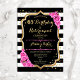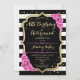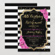 Inbjudan till födelsedags- och pensionsfest. Elegant design i svart, guld och rosa. Har svart-vita ränder, stilfullt skrivstil, falskt glitterguld och konfetti. Perfekt för en glamourös gemensam födelsedags- och pensionsfirande. Anpassa med dina egna detaljer.