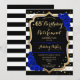 Inbjudan till födelsedags- och pensionsfest. Elegant design i svart, guld och royalblå. Funktioner svart och vita ränder, stilfullt script-teckensnitt, falskt glitterguld och konfetti. Perfekt för en glamourös gemensam födelsedags- och pensionsfirande. Anpassa med dina egna detaljer.