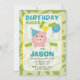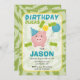 Du kan inte gå fel med lite grönt på en födelsedag! Denna inbjudan visar en söt spargris med festhatt och ballong, accentuerad med sedlar och mynt.