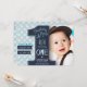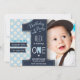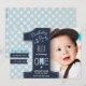 En söt & modern första födelsedags inbjudan med plats för ditt eget foto och en blå prick bakgrund. Original konst av Caroline Bonne Müller