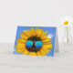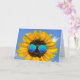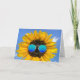 Retro solglasögon på gula solrosor med en blå sommarmoln bakgrund för födelsedagar.
