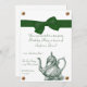 En vacker inbjudan till en damers tekalas eller födelsedagsfest. Den har en vintagebild av en grön tekanna längst ner och en grafik av ett grönt band och rosett längst upp. Grafik av guldbult prydder hörnen. Mycket elegant!
