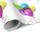 Färgglada födelsedagsballonger med lockigt hår och ögon på vit bakgrund.