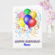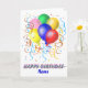 En bukett med ballonger och strömmare med ord Grattis på födelsedagen under dem. Det finns ett ställe att lägga till namn i mottagaren. Matchande porto frimärke finns tillgängligt.