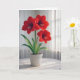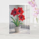 En röd amaryllisplanta med tre stora blommor pryder ett runt bord, vars ljus försiktigt filtreras genom tunna gardiner.