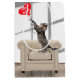 Tabby katt står på en beige läderstol och leker med en röd hjärtballong för födelsedag.