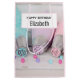 En födelsedagspresentpåse med ett vackert fotografi i pastellfärg. Dekorationer för tårta i pastellblått, rosa, persika och gult. Arrangerat på ett trädiskbord med små färgglada pärlor. En vit rektangel med en rosa ram överst med din personliga text inuti.