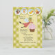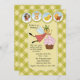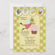 En nyckfull fe, en cupcakes och bilder på leksaker presenteras för att skapa denna födelsedagsinbjudan som har en rutig gul och grön bakgrund. Söt och rar så det räcker.