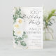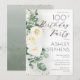 Fira en speciell milstolpe med denna eleganta inbjudan till 100-årsfest, med romantiska vita rosor och grön eukalyptus. Denna sofistikerade blomsterdesign kombinerar tidlös botanisk stil med modern typografi och skapar en vacker inbjudan till en elegant födelsedagsfirande.