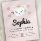 Vänner och familj från inbjudan för att fira ditt barns födelsedag med den här söta kattinbjudan