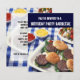 Familjen inbjudan och vänner till en födelsedagsfest barbecue Bq med denna söta inbjudan. Färska hamburgare, ketchup, senap, shiskebobs från grillen. Blått och vitt genomstruket tabellbakgrund. Anpassa med texten.