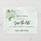 Ett flickaktigt och trendigt Spara datum-kort för en 40-års (eller vilken ålder som helst) födelsedagsfest. En stilren vit och grön akvarellbakgrund dekorerad med falska silverglittrar, vita blommor och grönska. Personifiera och lägg till ett datum och namn/ålder 40. Svarta bokstäver. Texten: Spara datum skrivs med en stor trendig handskriven stil.