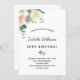 En enkel och elegant 50-års (eller vilken ålder som helst) födelsedagsinbjudan. En chic vit bakgrund. Dekorerad med akvarellblommor, blommor i vitt, rosa och roséguld med grönska. Personifiera och lägg till namn festdetaljer. Svart text.