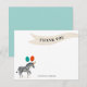 Det här platta tack-kortet har gott om utrymme att skriva ett enkelt " tack "-meddelande till födelsedagspresenter efter firandet och har en rolig viftande banderoll och en zebra som bär på en festhatt och ballonger.