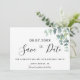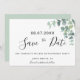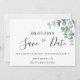 En modern Spara av kortet för en 50:e (eller någon annan) födelsedagsfest. En chic vit bakgrund som dekoreras med grönt vattenfärgad eukalyptus grey, löv och sprit. Anpassa och lägg till datum och namn/ålder 50 och ställe på platsen. Svart färgad brev. Texten: Spara datumet skrivs med ett stort trendig-handskript i stil. Bakåt: gröntens bakgrund färg.