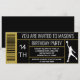 Basketball födelsedagsinbjudan med basketspelare på en svart och guldfärgad sko box etikett bakgrund. Lägg bara till dina evenemangsuppgifter.