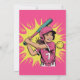 En levande popkonst-illustration visar en ung flicka mitt i ett spirerat softbollspel. Flickan, som utstrålar ungdomlig energi, är klädd i en skarp rosa-jersey med nummer "7" på framträdande plats och ett målmedvetet leende ljus uppåt i ansikte när hon griper ett fladdermus, redo att ansluta sig till softbollen. Den dynamiska bakgrunden exploderar med kraftfull gult och rosa graffiti-stil snurrar och former, skapar en känsla av rörelse och upphetsning kring flickan. Mjukt, diffust solljus slår till och accentuerar det fet färg och lekfull estetik samtidigt som man belyser den softboll som är upphängd mitt i luft nära fladdermus.