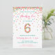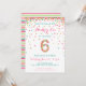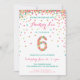 Fira din 6-årings födelsedag med färgstark guld, rosa, mint och teal konetti på dessa 6e-födelsedagsinbjudningar! Med din dotters party-detaljer och ett "6" i konetti. Rubriken lyder: "Hooray for cakes and gifts!" Färgstark rand på baksidan. Den här beundransvärda designen är söt och giftig för toppen.