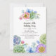 Vibrant vattenfärg födelsedagsfest inbjudan med rosa och lila blommor, sukulatorer och eukalyptus löv.