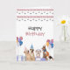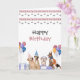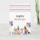 Späda valpar med födelsedagshattar, gåvor och färgstarka ballonger. Firandet är sitta på en lila kudde framför kakan. Bakgrunden är vit