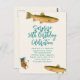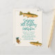 Vuxen manliga födelsedagsfest inbjudan-vykort för en fiskare oavsett ålder. Fläckig regnbåge och flygfiske-jig-design på papper yta med mörk blått grönt. Större skript överst kan anpassas till en överraskning för party, eller så kan den ordalydelsen inkludera hans namn, som till exempel "Lycklig 50:e födelsedagen Thomas". Adress kan läggas till, en efter en, på baksidan av inbjudningarna, eller köpa vykorten tomma för skriva.