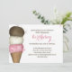 Denna design har en söt akvarell glass födelsedag, ett stilrent trendigt kalligrafi-skrift, QR-kod webbplats online URL, Facebook social medie evenemangssida, en rolig festlig fantasifull firande, en glasskula våffelkon, en enkel minimalistisk minimal design, en sommar födelsedag firande fest, en rosa vit choklad brun, en Neapolitansk smak glass kon
