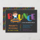 Studsa på över och fira med födelsedagpojken! Denna inbjudan har orddunet i stort stilsortsformat med varje brev i en olik färg! Brevnollan byts ut creatively med en rundatrampoline, och en pojke i vitutslagsplats- och blåttkort studsar lyckligt på den. På den omvända sidan är ett skapat mönster att använda pricker och färgar av regnbågen. För någon som varar värd födelsedagsfesten på inomhus trampolineparker eller på deras egna trädgård. Personifiera med ditt party specificerar i färgglad text.
