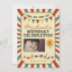 Födelsedagsfest inbjudan för fotovintagecirkus -- handla demofotoet till en bild av ditt primat. Varje cirkusinbjudan låter också dig ändra numrera på ballongen till hur gammalt ditt barn ska är för hans eller henne födelsedagen. Cirkusinbjudan dekoreras med randar, stjärnor, & standerter i gammalmodiga deppigheter, den gulnar, röda och kräm- färgläggningen för en vintagekänselförnimmelse. Giraff, lejon, apor, rhinos och elefanter tillfogas också för ökad dekor.