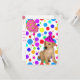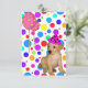 Inbjudan Flickas Födelsedagshändelse Fest Rosa och Gula Stjärnballonger, Flerfärgade Fläckar på Vit Labradorvalp med Rosa och Svart Fläck Festhatt.