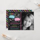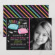 Regnbåge Neon Soverparty Inbjudan. Denna design har en rosa och blå kudde med fjädrar och stjärnor. Ljus regnbågsneon färg sticker verkligen ut mot den svarta bakgrunden. Regnbågsränder på baksidan. Anpassa denna anpassade inbjudan med din egen pyjamassfest detaljer.