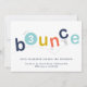 Den här inbjudan till födelsedagsfest med studsmatta har studsande bokstäver i marinblått, akvatint, gult och orange med den redigerbara åldern i O.