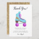 Roligt tackkort för födelsedagsfest med tema rullskridskoåkning med vintage-vibbar. Det finns en handritad illustration av en rullskridsko i rosa och blå färger med en falsk guldglitterblixt form tryckt på den. I standardmeddelandet står det "tack för att du rullade förbi". Anpassa denna produkt genom att lägga till ditt barns namn.