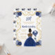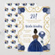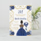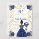 Födelsedagsfest inbjudan har en elegant guld ram, en vacker prinsessa med mörk och en marin blå klänning, blommor och ballong. Det här är perfekt för en födelsedagsfest.