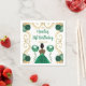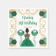 Den här födelsedagsinbjudan till napkin är en elegant guld ram, en vacker prinsessa med mörk hud och en grönt klänning, blommor och ballong. Det här är perfekt för en födelsedagsfest.