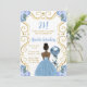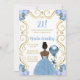 Denna födelsedagsinbjudan har en elegant guldram, en vacker prinsessa med mörk hy och en dammig blå klänning, blommor och en ballong. Det här är perfekt för en födelsedagsfest.