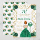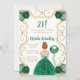 Födelsedagsfest inbjudan har en elegant guld ram, en vacker prinsessa med rött hår och en grönt klänning, blommor och ballong. Det här är perfekt för en födelsedagsfest.