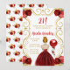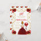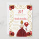 Födelsedagsfest inbjudan har en elegant guld ram, en vacker prinsessa med rött hår och en röd klänning, blommor och ballong. Det här är perfekt för en födelsedagsfest.
