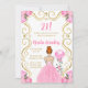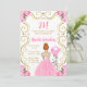 Födelsedagsfest inbjudan har en elegant guld ram, en vacker prinsessa med rött hår och en rosa klänning, blommor och ballong. Det här är perfekt för en födelsedagsfest.