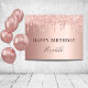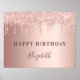För en giftig och glamorös födelsedagsfest. En metallisk bakgrund i ro guld tittar med glitter droppar, färgdroppstift. Anpassa och lägg till ett namn. Namn är skrivet med ett modernt handskript i stil. Text: Grattis på födelsedagen