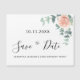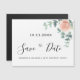 Ett modernt Spara datum magneter-kort för en 50:e (eller någon ålder) födelsedagsfest. På framsidan: En chic vit bakgrund som dekoreras med grönt vattenfärgad eukalyptus grenery och ro guld färgad ro, blommans blommigt. Anpassa och lägg till datum och namn/ålder 50. Svart färgad brev. Texten: Spara datumet skrivs med ett stort trendig-handskript i stil.