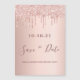 Ett giftigt och trendig Spara datumkortet för en 50:e (eller någon annan ålder) födelsedagsfest. En feminin rosa, ro guld-bakgrund som dekoreras med ro guld droppar. Mallar för ett datum och namn/ålder 50. Mörk ro guld färgad brev. Texten: Spara datumet skrivs med ett stort trendig-handskript i stil.