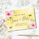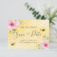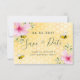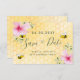 Lycklig, leende bin, rosa blommor och gult bikaka som bakgrund. Anpassa och lägg till ett datum och namn. Svart färgad brev. Texten: Spara datumet skrivs med ett stort trendig-handskript i stil.