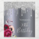 En etikett för en 50:e födelsedagsfest eller vilken åldersgrupp som helst. En mörk faux silver metallic tittar bakgrund. Dekorerad med mörkens lila och blommor från burgundy och ro rosa, faux glitter droppning, färgdropputseende. Mallar för namn och ålder. Texten: 50:e födelsedagen är skriven med ett stort modernt handskript i stil.